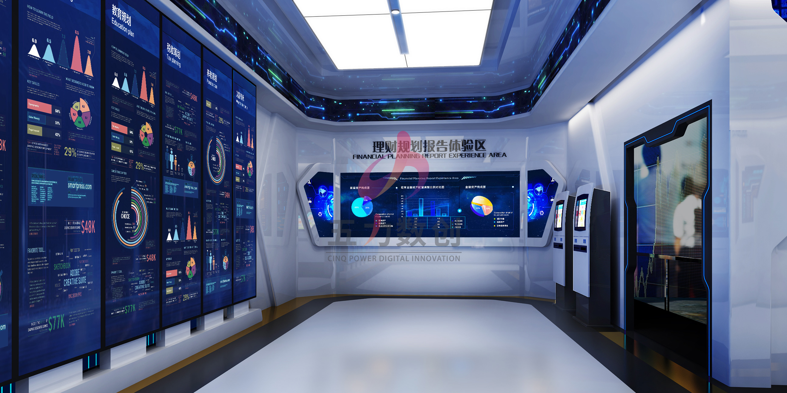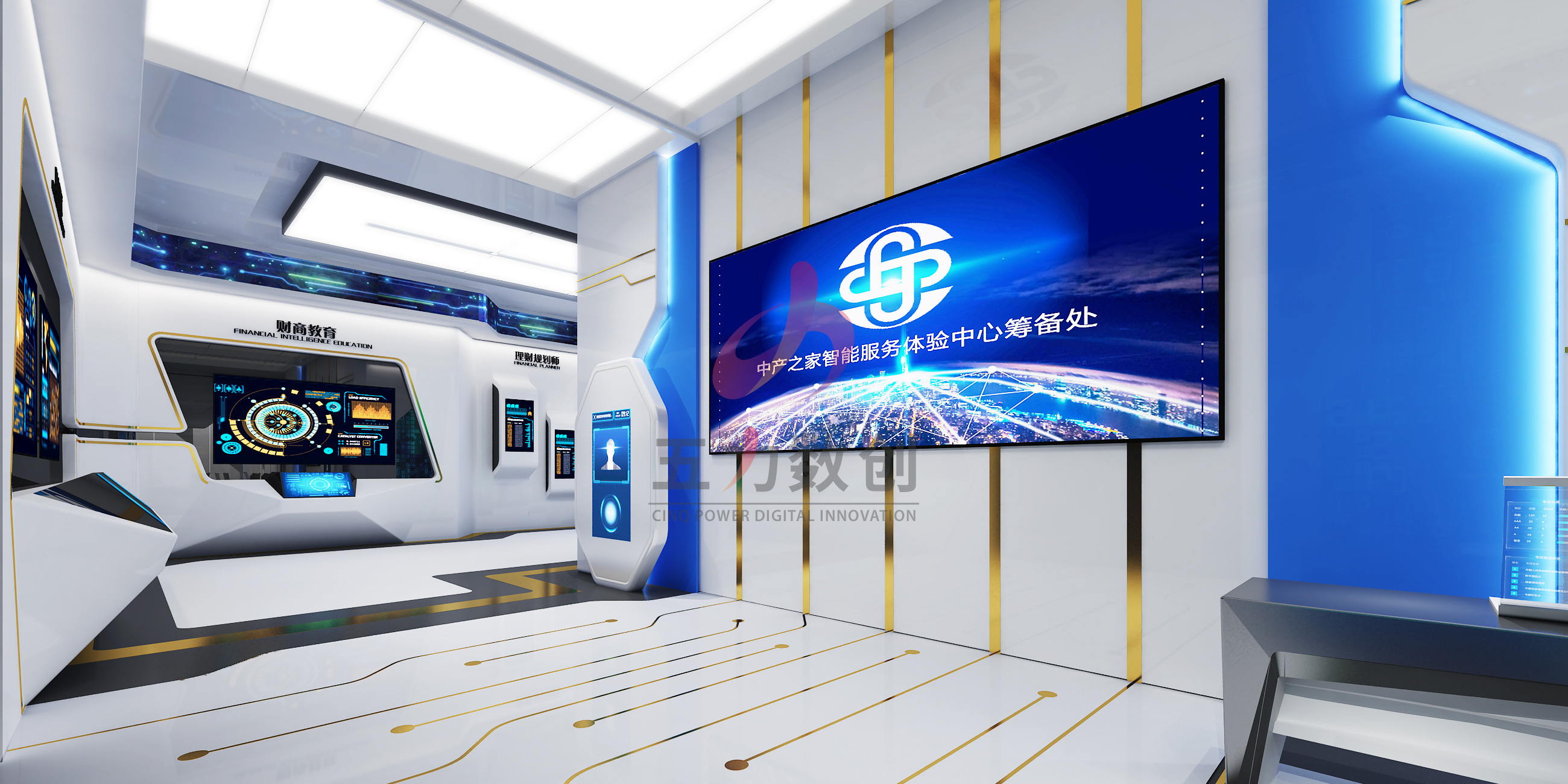 五力數創根據中產之家需求,為中產之家智能服務體驗中心打造富有科技感的數據展示空間,營造沉浸式體感互動的主題空間,綜合展示企業綜合實力。
