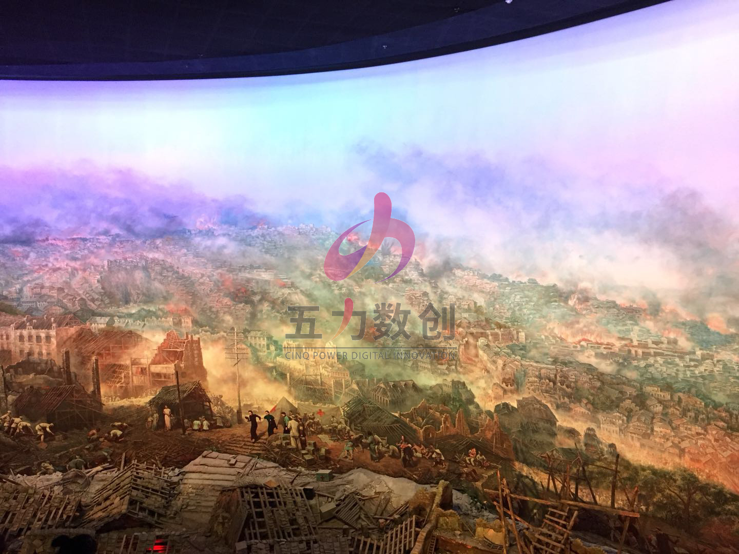 三峽博物館崢嶸歲月廳運用定點投影、半景畫、虛擬現實等高科技技術,契合《重慶大轟炸》巨幅油畫,實現精準定位融合,再輔以燈光,將《重慶大隧道慘案》場景完美復原,形成三位一體的獨特展現模式,構成宏大的歷史畫卷,真實還原戰時重慶,給參觀者深刻的體驗和印象。